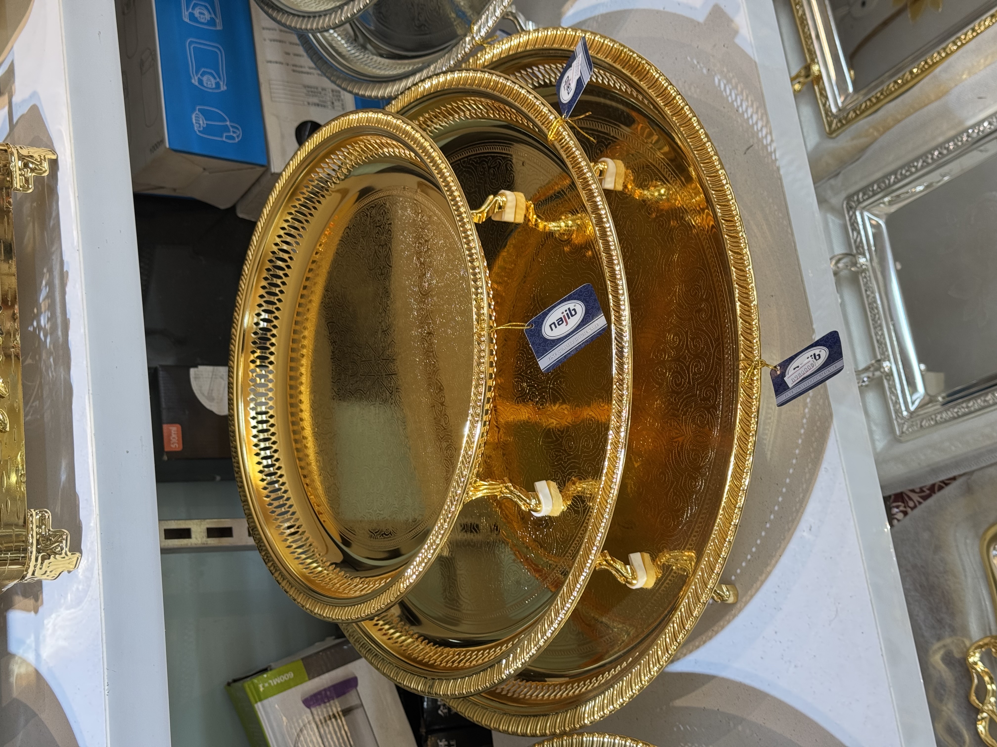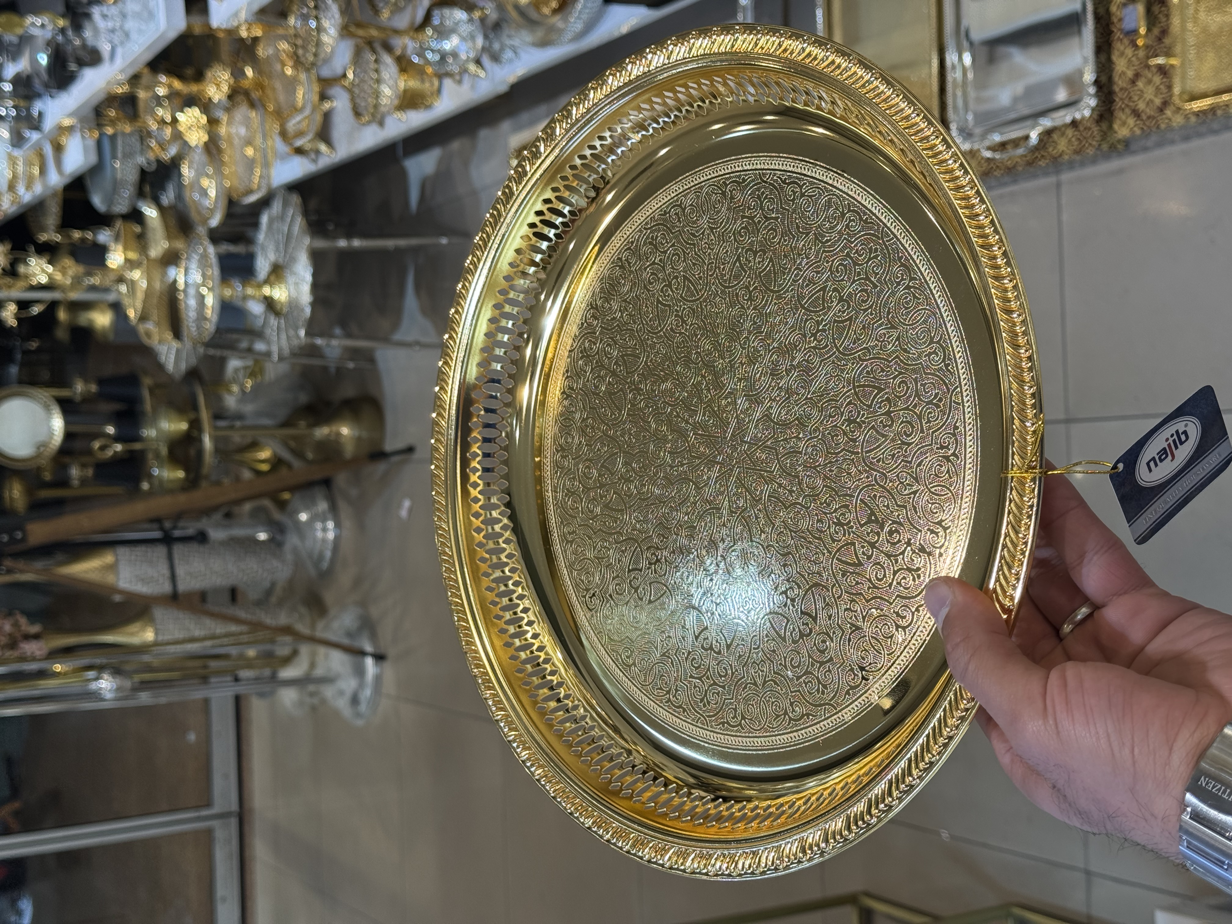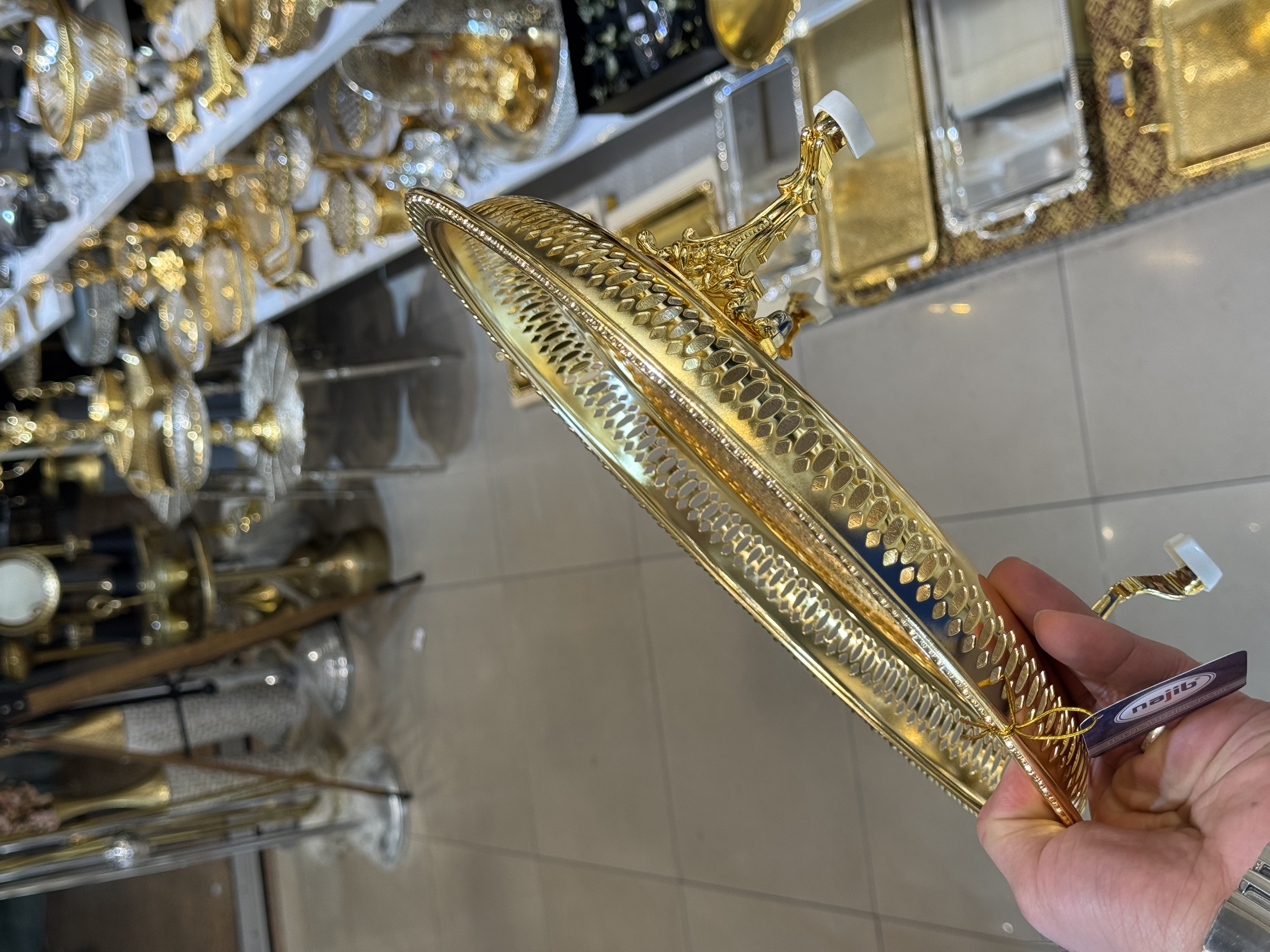 سینی پایه دار برند نجیب امارات 🇦🇪 رنگ گلد در سه سایز قطر ۳۵-۴۵-۵۵ سانت📏 با ضمانت ثبات رنگ ✅ مناسب پذیرایی غذای گرم ، میوه ، فینگر فود و...
